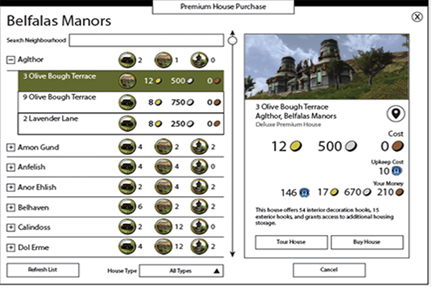 Когда я занялся дизайном интерфейса для новой системы домов LotRO, мною в основном двигало стремление упростить опыт взаимодействия игроков с новым окном покупки домов премиум-класса. В результате нам понадобилось пересмотреть и существующее оформление окна для классических домов — чтобы найти оптимальное сочетание для обоих типов домов в едином интерфейсе. Держа в голове эти цели, я разложил в Illustrator [примечание Дозорных: скорее всего, имеется в виду программа Adobe Illustrator] основные панели интерфейса с учётом и существующих, и новых функций (над изменением многих из которых мы всё ещё работаем).