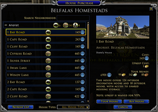 Дома премиум-класса — это новый уровень поселений, и приобрести эти роскошные дома можно за мифриловые монеты. Арендную плату по-прежнему можно оплачивать золотом, как и за классические дома, однако обладатели VIP-подписки освобождены от этой обязанности (в том числе и главы содружеств)! Кроме того, игроки могут владеть неограниченным количеством домов премиум-класса одновременно.